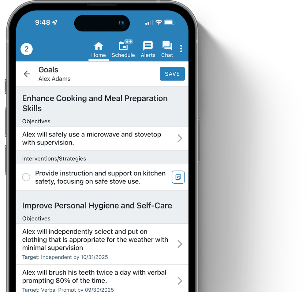 Field staff can document care activities, interventions, and progress toward goals directly from their mobile device, even when internet access is unreliable. Whether in-home or within the community, your team can stay focused on care, not paperwork.